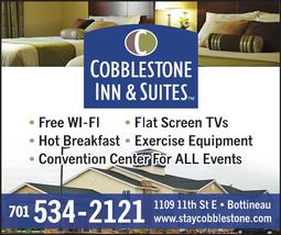 Welcome to the Cobblestone Inn & Suites in Bottineau, North Dakota. Our beautiful hotel is conveniently located near everything that Bottineau, North Dakota has to offer including St Andrews Health Center, Dakota College at Bottineau, Tommy Turtle, the Central Flyway, International Peace Gardens, and our onsite conference center built to entertain up to 500 people.
